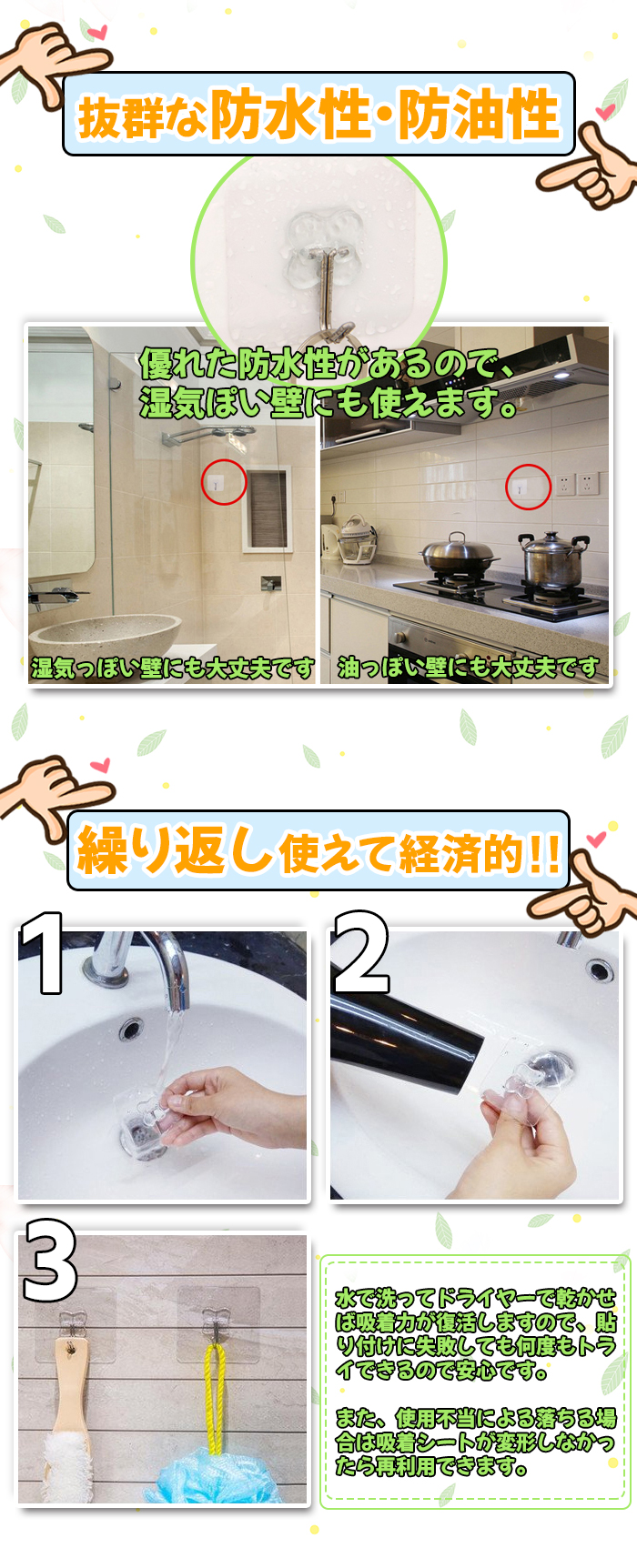 優れた防水性があります。一般のフックにとって水はタブーですが、弊社のフックは水周りでも平気です。湿気ぽい壁にも使えます。なお吸着シートと粘着グルーは透明で、壁に貼っても省スペースですから、壁の綺麗さに悪影響を与えません。