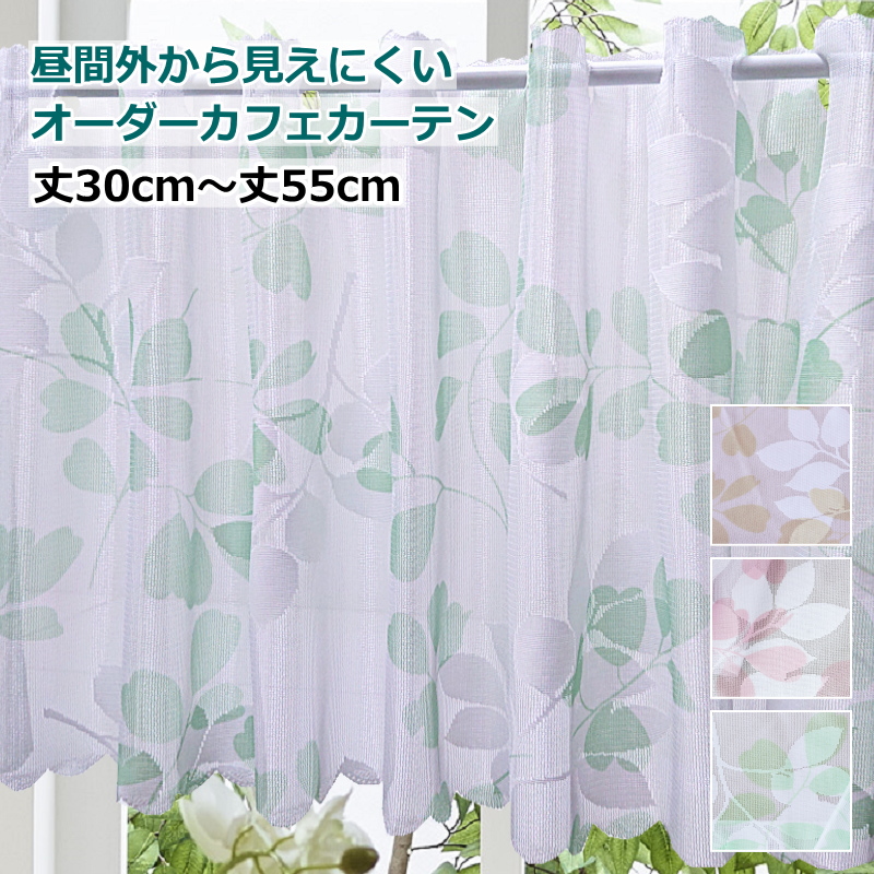 オーダーカフェカーテン レース リーフ柄 昼間外から見えにくいミラー 製品幅140cm(適応窓幅70cm〜幅100cm) 丈30cm 丈35cm 丈40cm 丈45cm 丈50cm 丈55cm