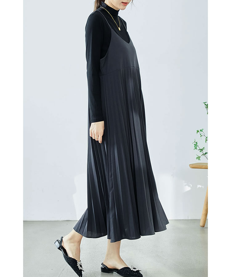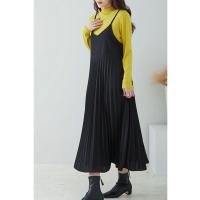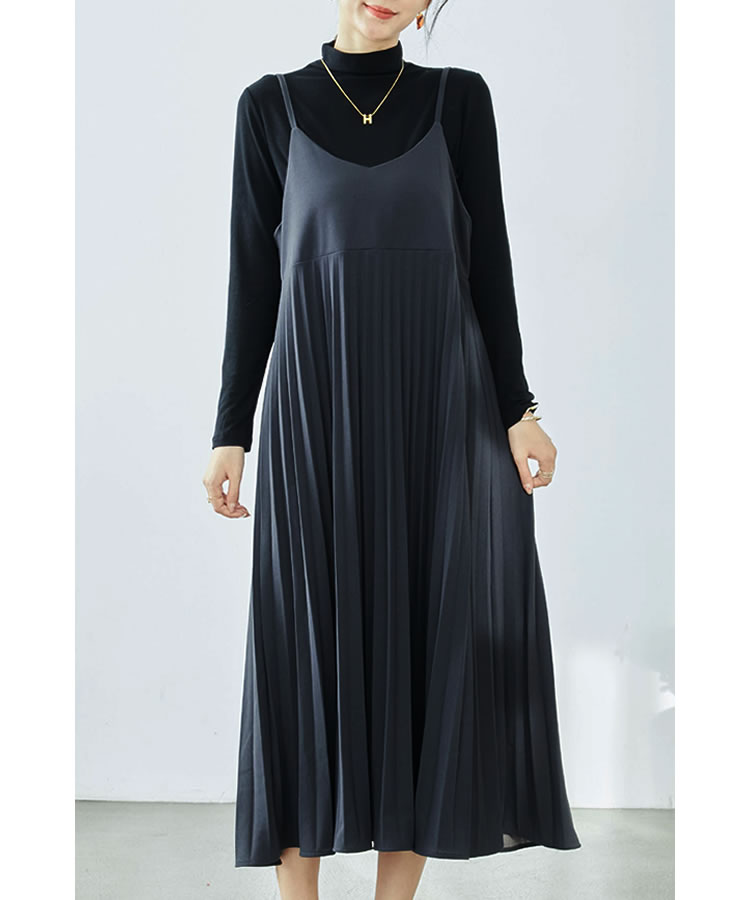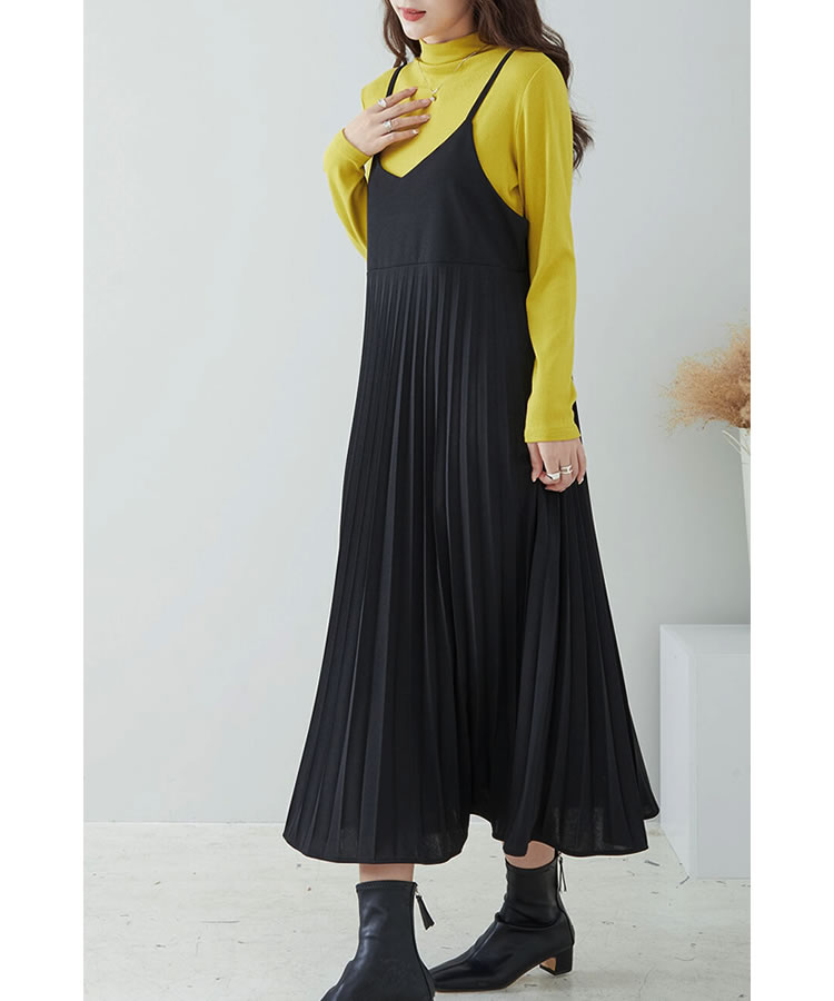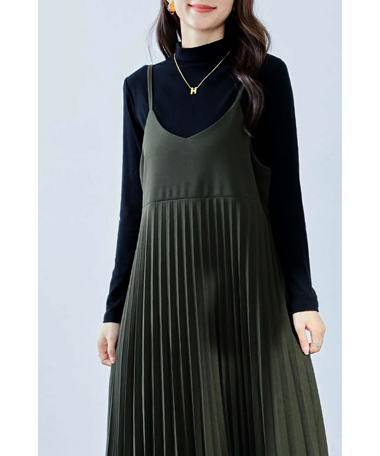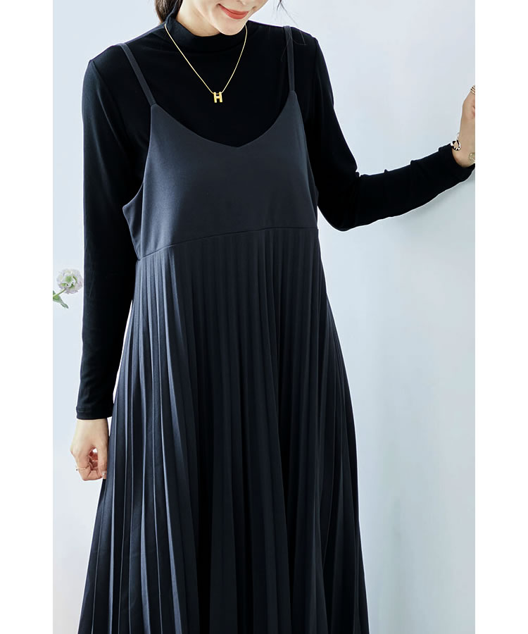細見え効果もあるプリーツ加工を施した大人のキャミソールワンピース。ストレッチ素材入りの生地を使用し、ゆったりフレアシルエットなのでストレスフリーな着心地◎コーデ次第でオールシーズン大活躍のキャミワンピです。