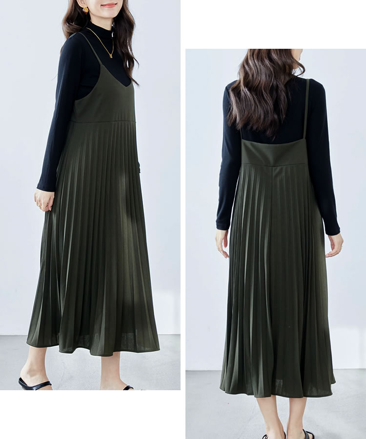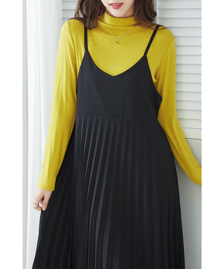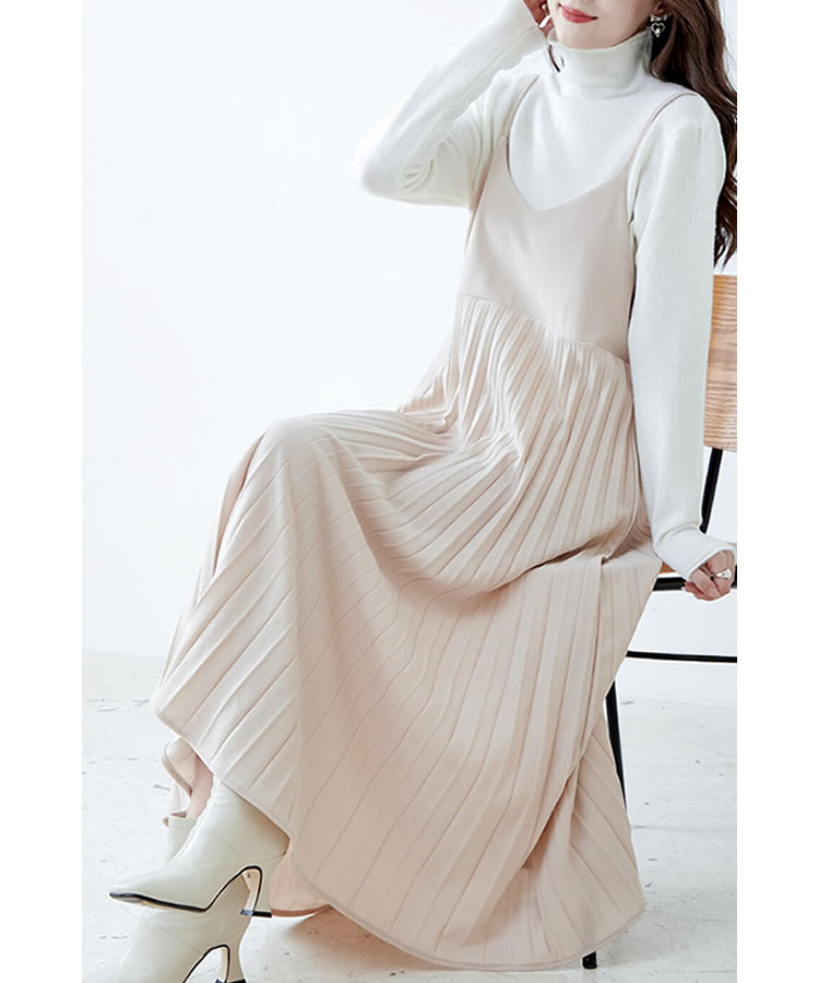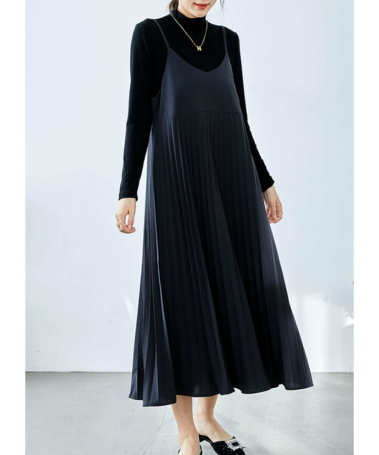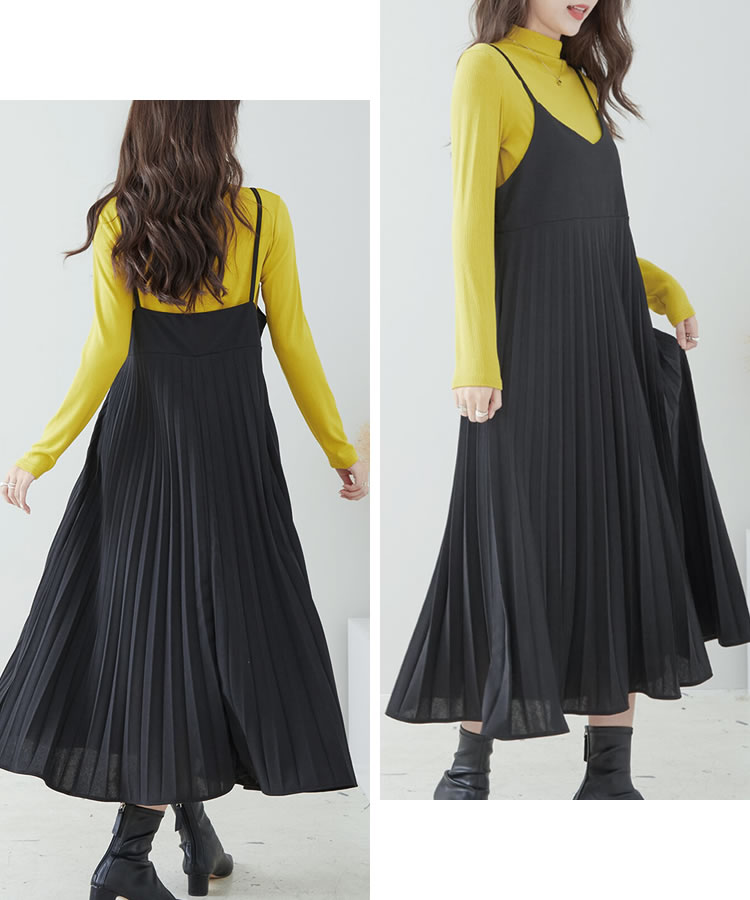細見え効果もあるプリーツ加工を施した大人のキャミソールワンピース。ストレッチ素材入りの生地を使用し、ゆったりフレアシルエットなのでストレスフリーな着心地◎コーデ次第でオールシーズン大活躍のキャミワンピです。