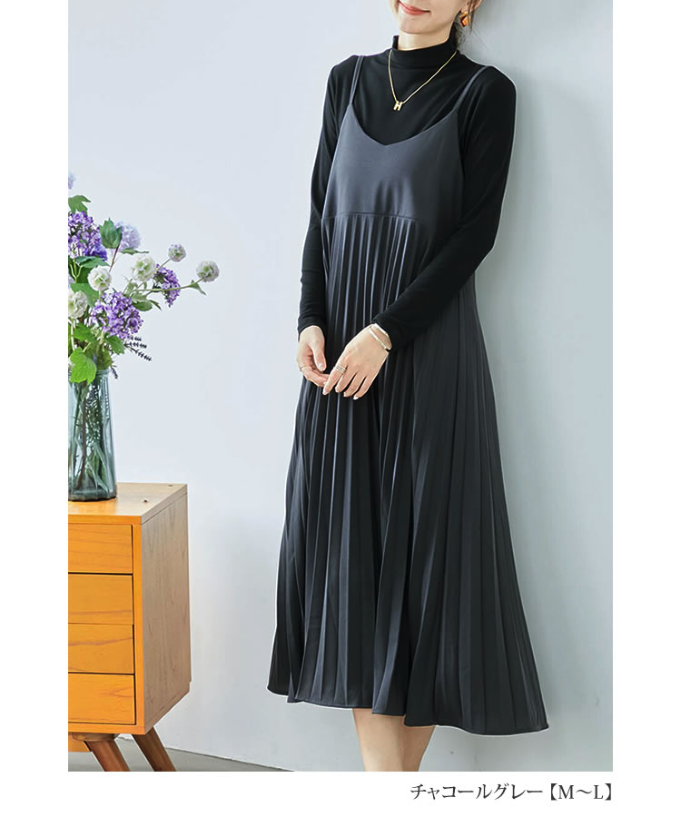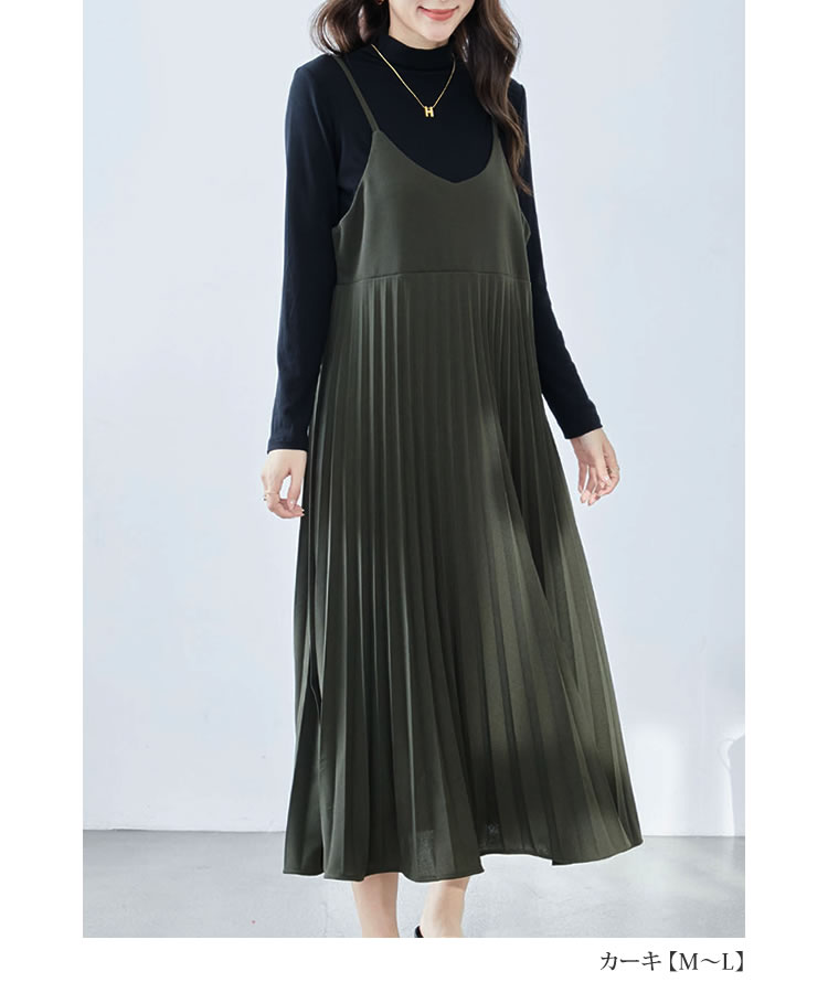 レディース キャミワンピース プリーツ キャミワンピ フレア 美シルエット ロング ストレッチ 上品 ゆったり 大人 40代 50代