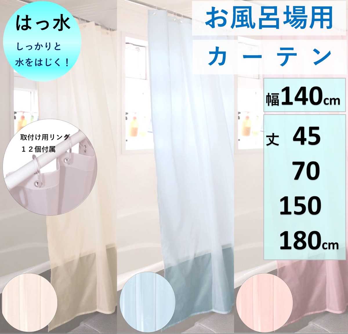 【撥水加工付シャワーカーテン】製品サイズ 幅140丈150,180cm