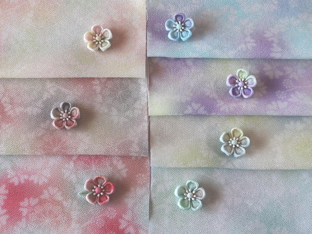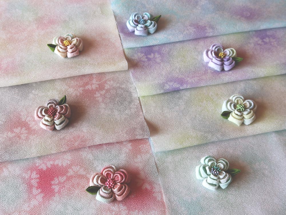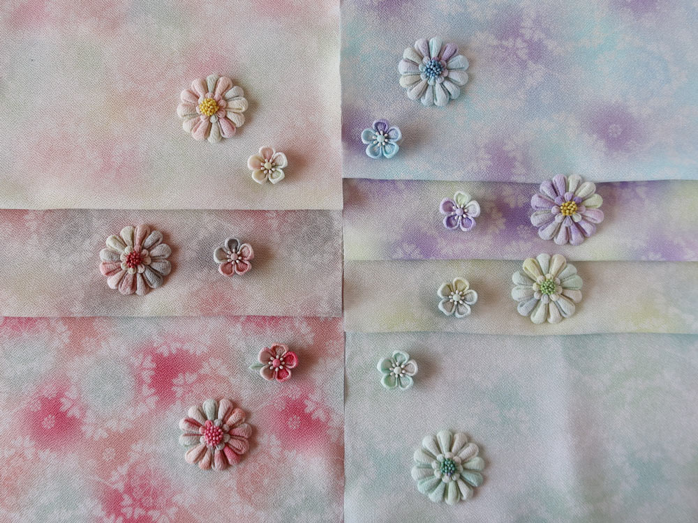 大人気のつまみ細工作家・つゆつきさんデザインの一越ちりめん「オルレアレースぼかし」7色を、使いやすいサイズのセットにしました。