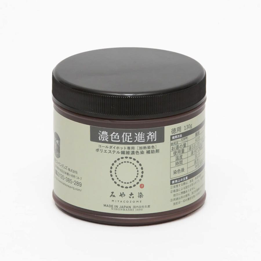 ポリエステル繊維やポリエステル混紡の布を「コールダイホット」で濃い色に染めたい時に使う専用助剤です。