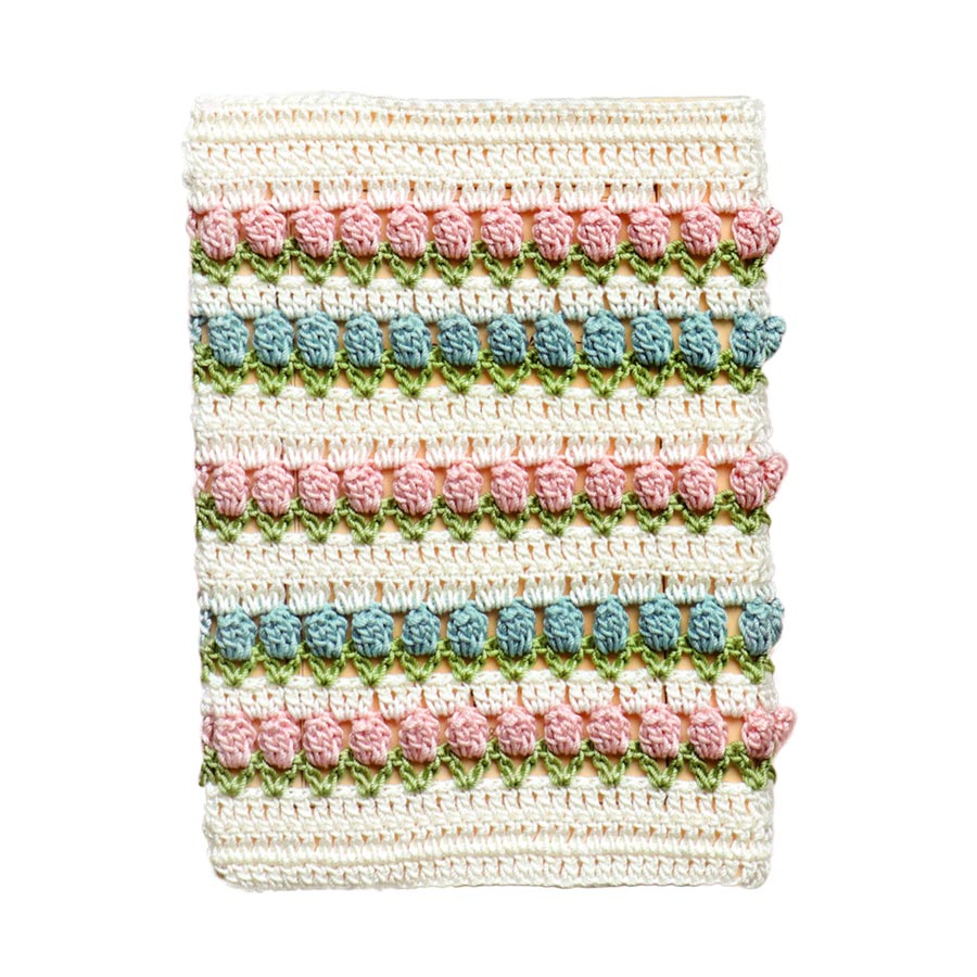 SNSでも注目☆ かわいらしいチューリップ模様が並ぶブックカバーの編み物キット。