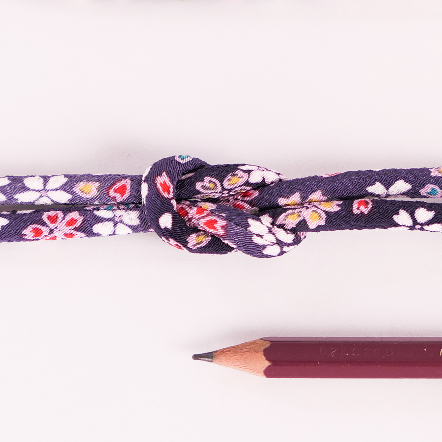 ●赤、青、黄色に色づく花びらが可愛いちりめん丸ひも。しっとりとした紫に小さな桜が可憐です。