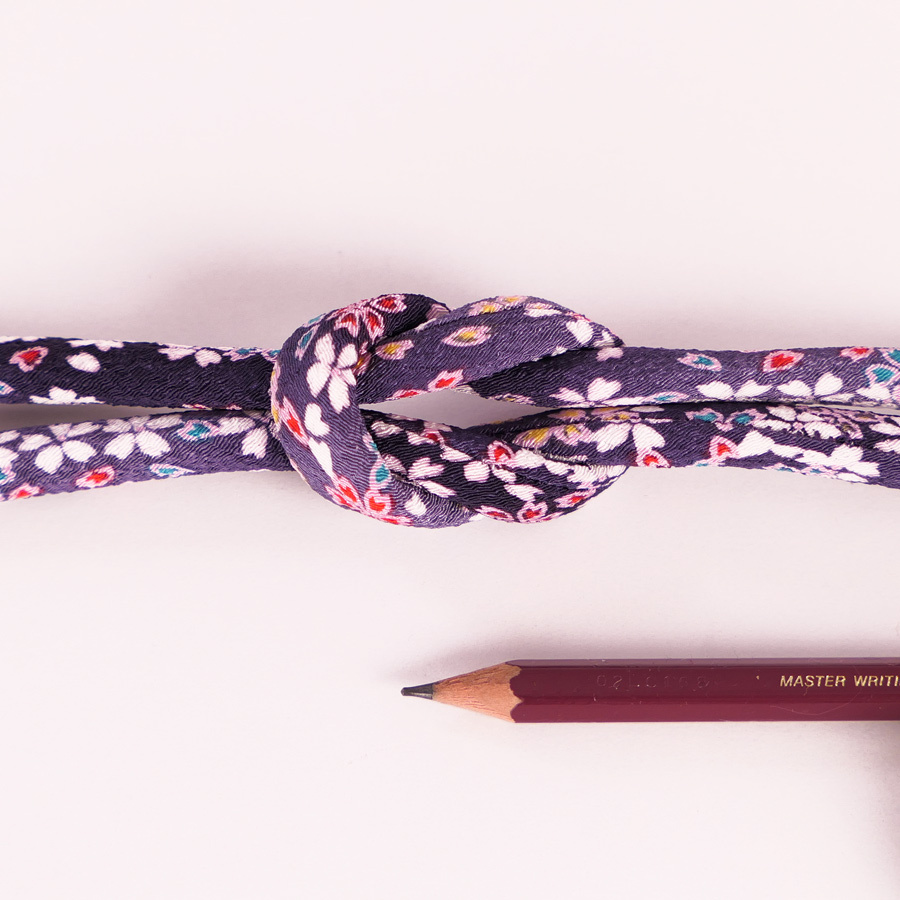 ●赤、青、黄色に色づく花びらが可愛いちりめん丸ひも。しっとりとした紫に小さな桜が可憐です。