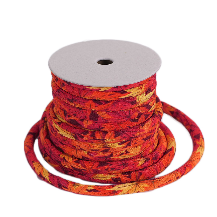 秋の紅葉を描いた絵柄をちりめん丸ひもにしました。朱赤からオレンジ、からし色に移り変わる彩りが、美しく印象的です。