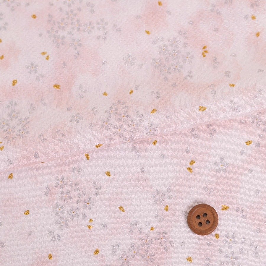 ほんのりとした淡い色のぼかしに銀色の小桜と金色の花びらが散らされた、やさしい印象のちりめん生地。