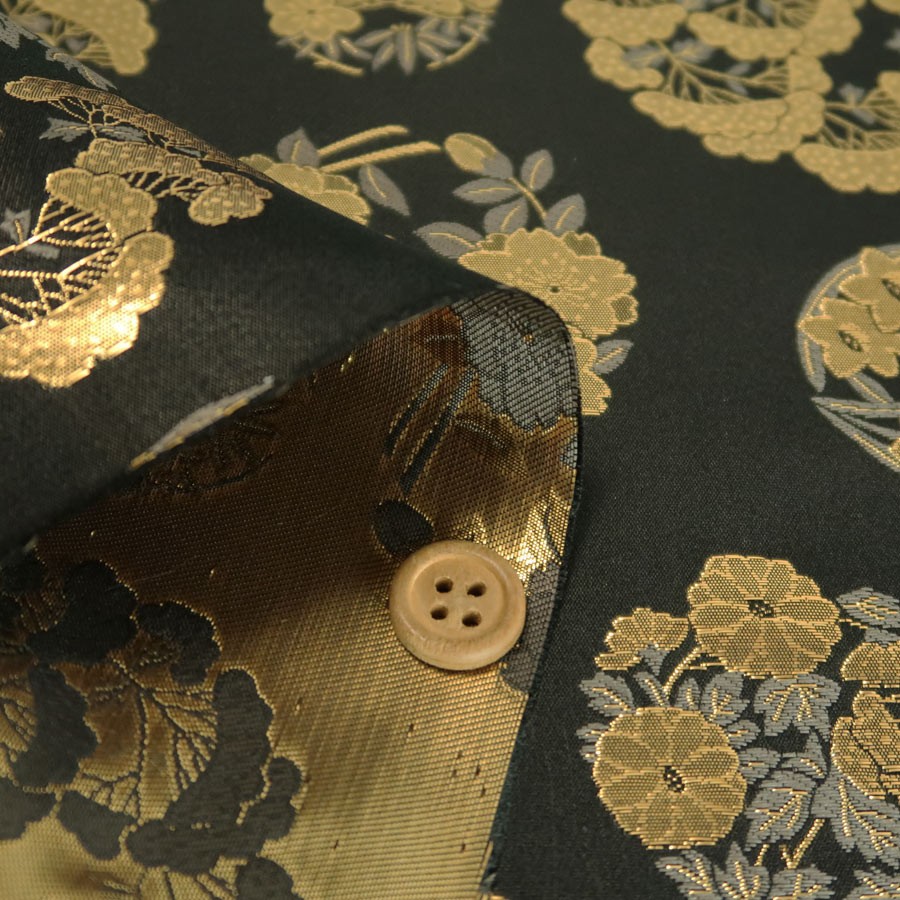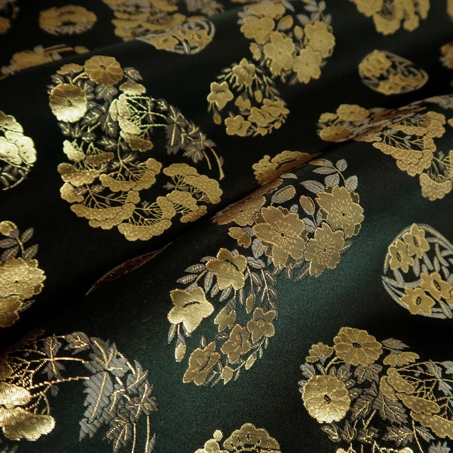 ●丸くかたどられた中にゴールドの花や松がつどう美しい西陣織金襴生地。