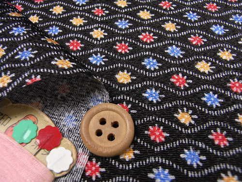 ちりめんカットクロス・横波に丸花(黒) 23×33cm