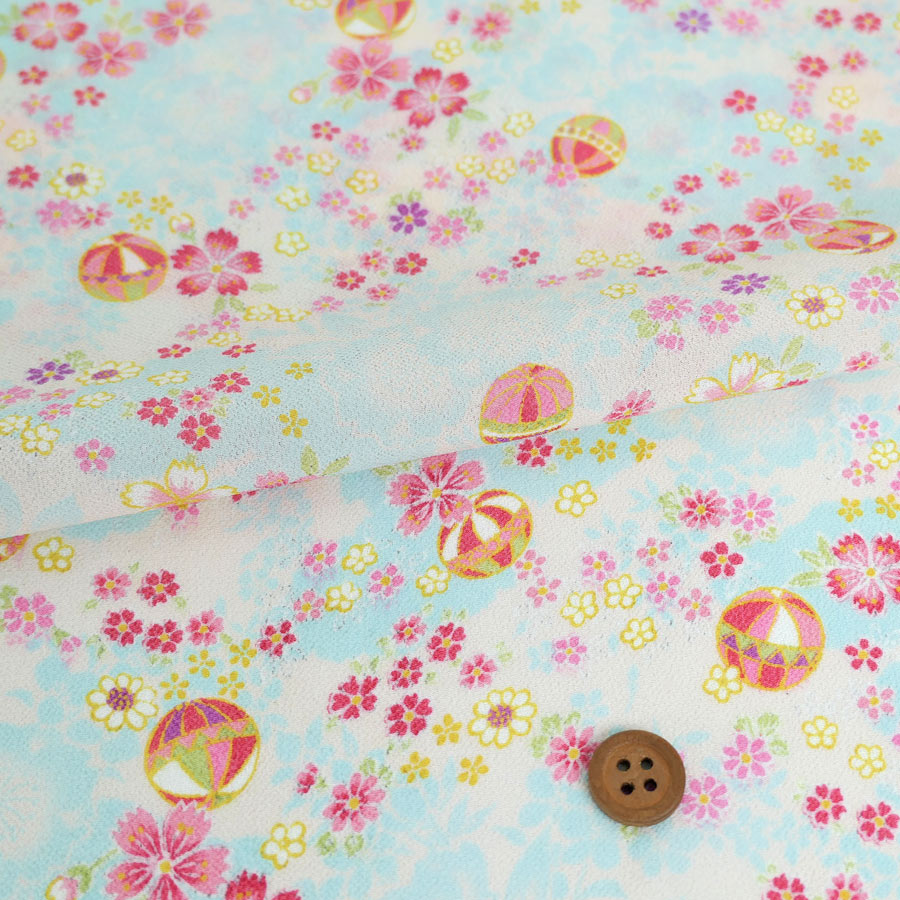 一越ちりめん生地 かすみ桜に手まり(水色) 10cm単位 切り売り