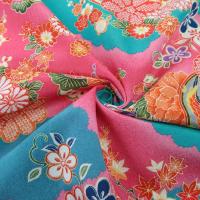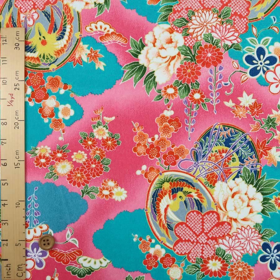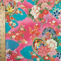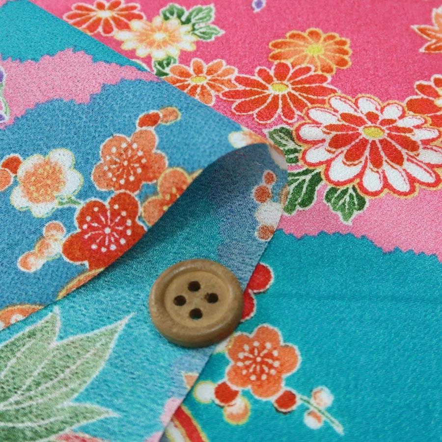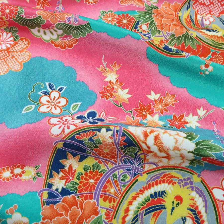 一越ちりめん生地 雲取り花鼓文様(青/ピンク) 10cm単位 切り売り