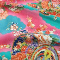 このちりめんは手捺染〜布の上に型を置き、人の手によって染めていく方法で染色されました。機械染めよりはるかに手間がかかりますが、機械では不可能な多色使いにより深みのある精巧な染めが可能です。実物をご覧いただくと納得していただけると思います。