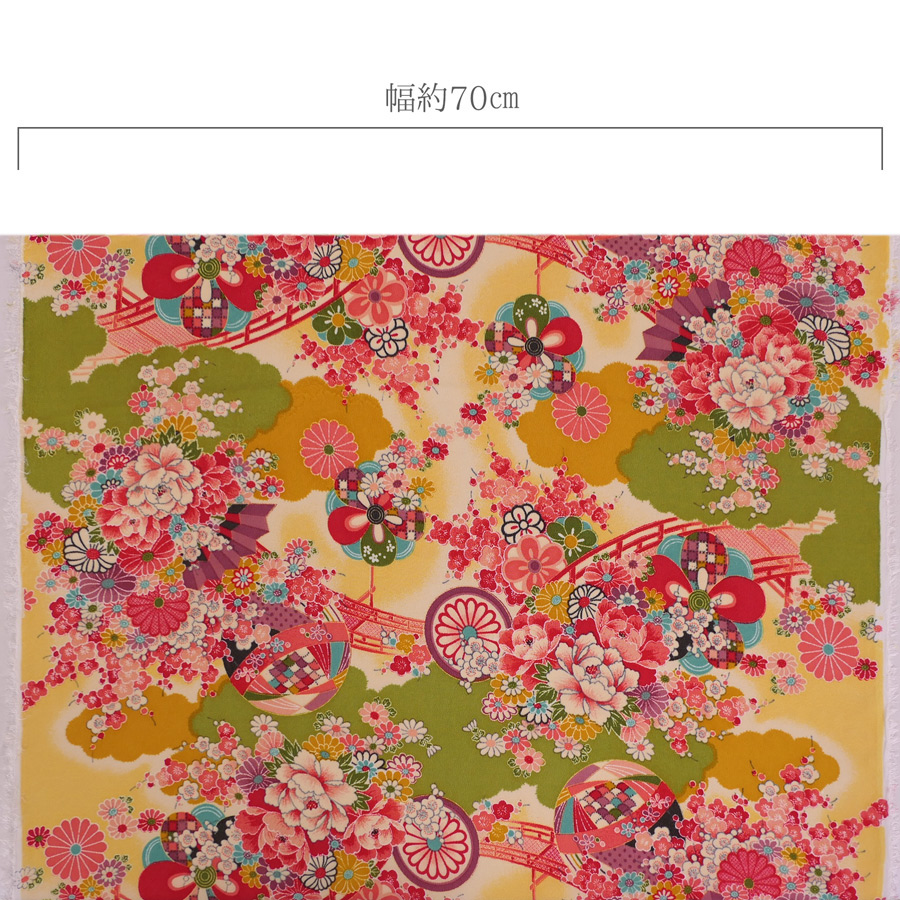 京都の友禅工場に保存されていた50年程前の友禅型をそのまま使って手捺染で染め上げた生地です。当時、女の子の着物用に製作されたもので、懐かしい雰囲気いっぱいの古布再現ちりめんです。手捺染(説明は下に)ならではの精緻な柄も魅力。柄も大きすぎず使いやすいと思います。たて約51cmずつ同じ柄がくり返しています。