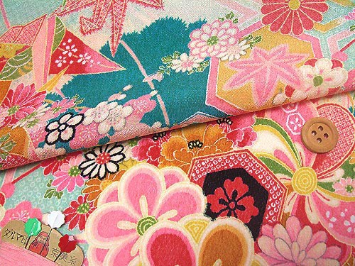 ●京都の友禅工場に保存されていた40年程前の友禅型をそのまま使って手捺染で染め上げた生地です。当時、女の子の着物用に製作されたもので、懐かしい雰囲気いっぱいの古布再現ちりめんです。手捺染(説明は下に)ならではの精緻な柄も魅力。柄も大きすぎず使いやすいと思います。