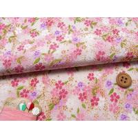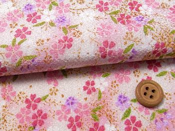●エレガントな4色の桜と緑の葉の上から、筆を振って絵の具を飛び散らせたような金が少し大胆な印象の桜柄ちりめん。