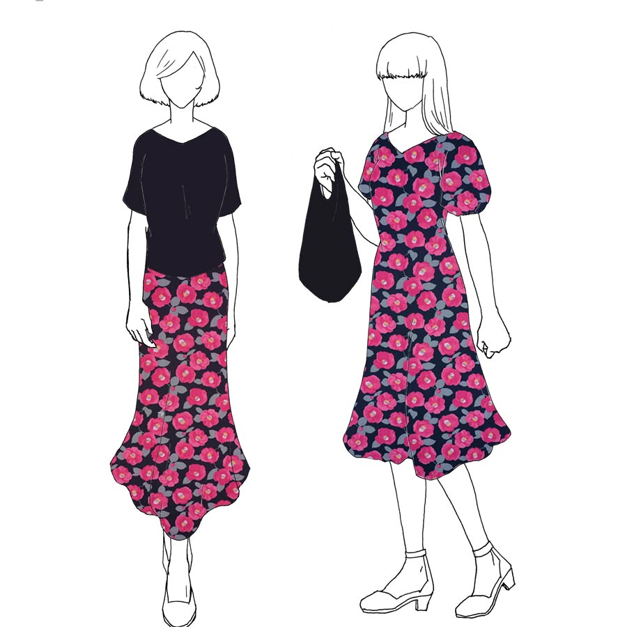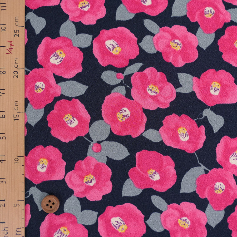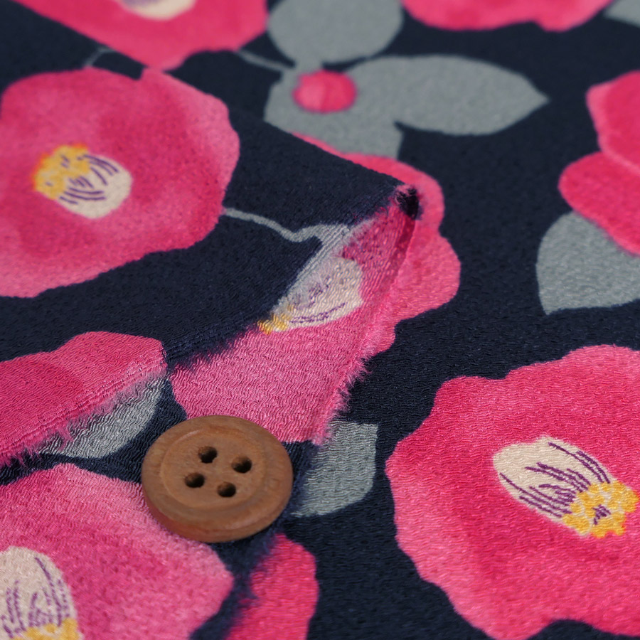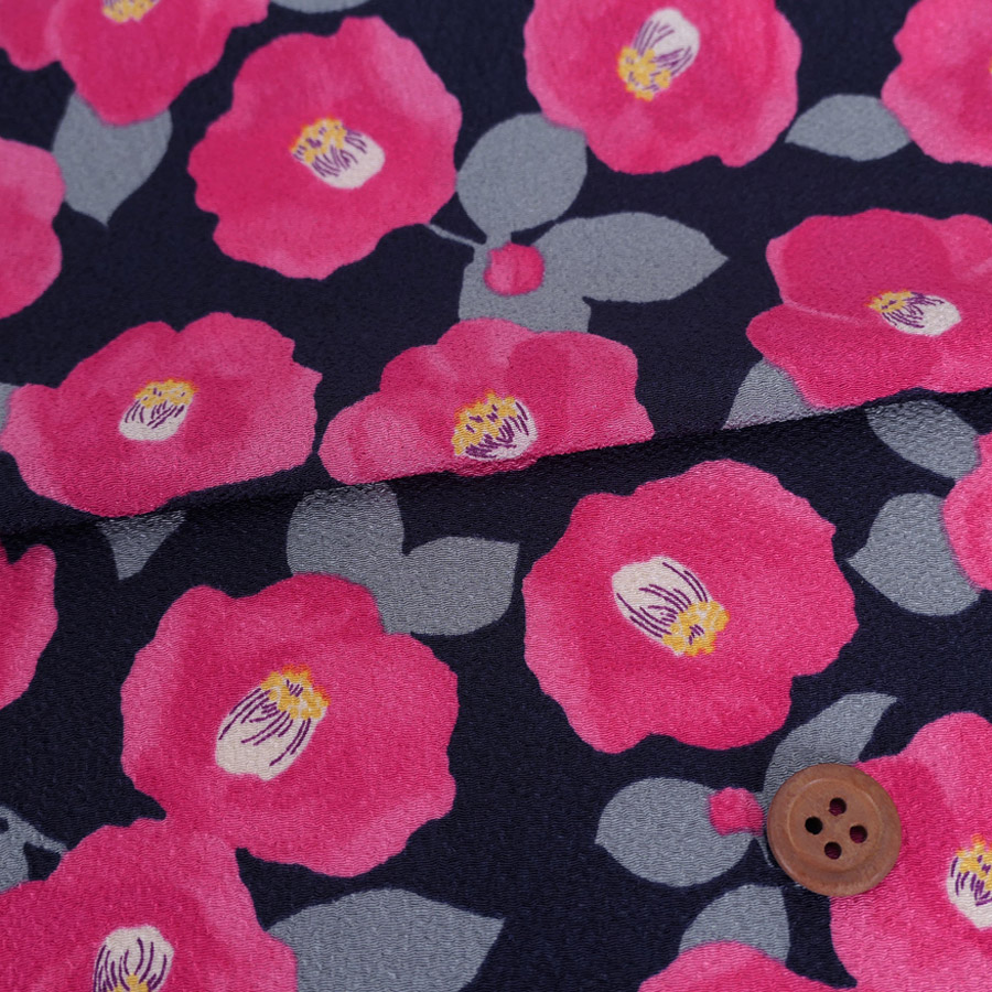 ポリちりめん生地 水彩風の椿(濃紺) 10cm単位 切り売り