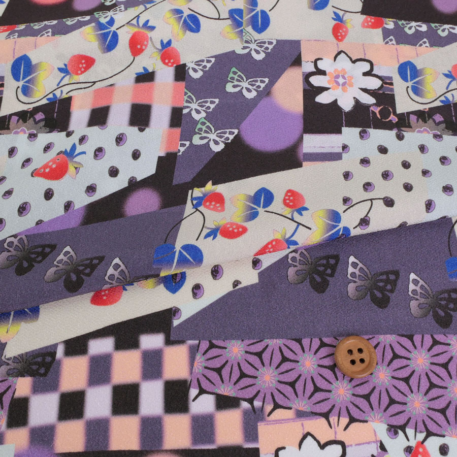 蝶やいちご、大小の水玉などがパッチワークのように切りばめられています。どこか洋風ながら、背景の市松やクレマチスの花にも見える麻の葉など、和のテイストもしっかりアピールするデザインがモダンで素敵。