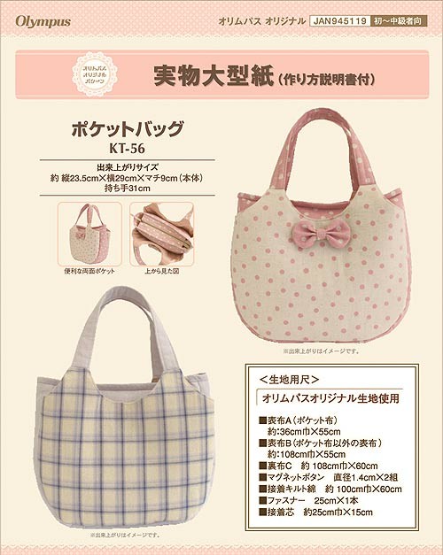 | 商品案内 | オリムパスの「実物大型紙(作り方説明書付き)」シリーズのパターンです。 便利な両面ポケットで使い勝手のいいバッグの型紙です。 ●出来上がりサイズ:約 縦23.5cm×横29cm×マチ9cm(本体)、持ち手31cm ●生地用尺:表布A(ポケット布)/約36cm幅×55cm 表布B(ポケット布以外の表布)/約108cm幅×55cm、裏布C/約108cm幅×55cm ●その他:マグネットボタン/直径1.4cm×2組、接着キルト綿/約100cm幅×60cm、、ファスナー/25cm×1本、接着芯/約25cm幅×15cm |