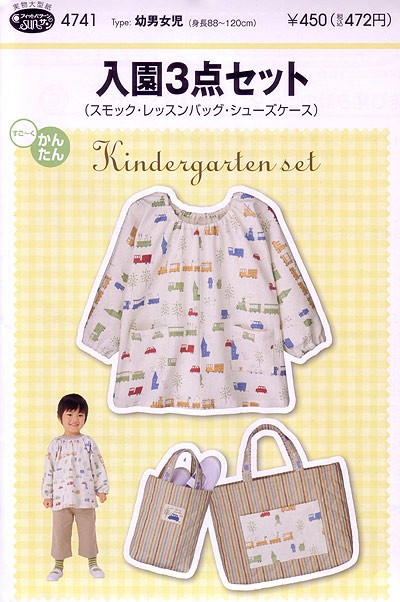 ●見頃からの続き袖デザインのスモックは衿ぐり、袖口にゴムを入れて、着やすく、さらにつくるのも衿ぐり、袖口とも縫い代を折ってゴムを通すだけのかんたん仕上げ、初めての入園準備するママにおすすめ。