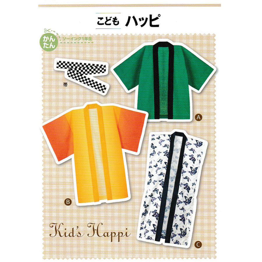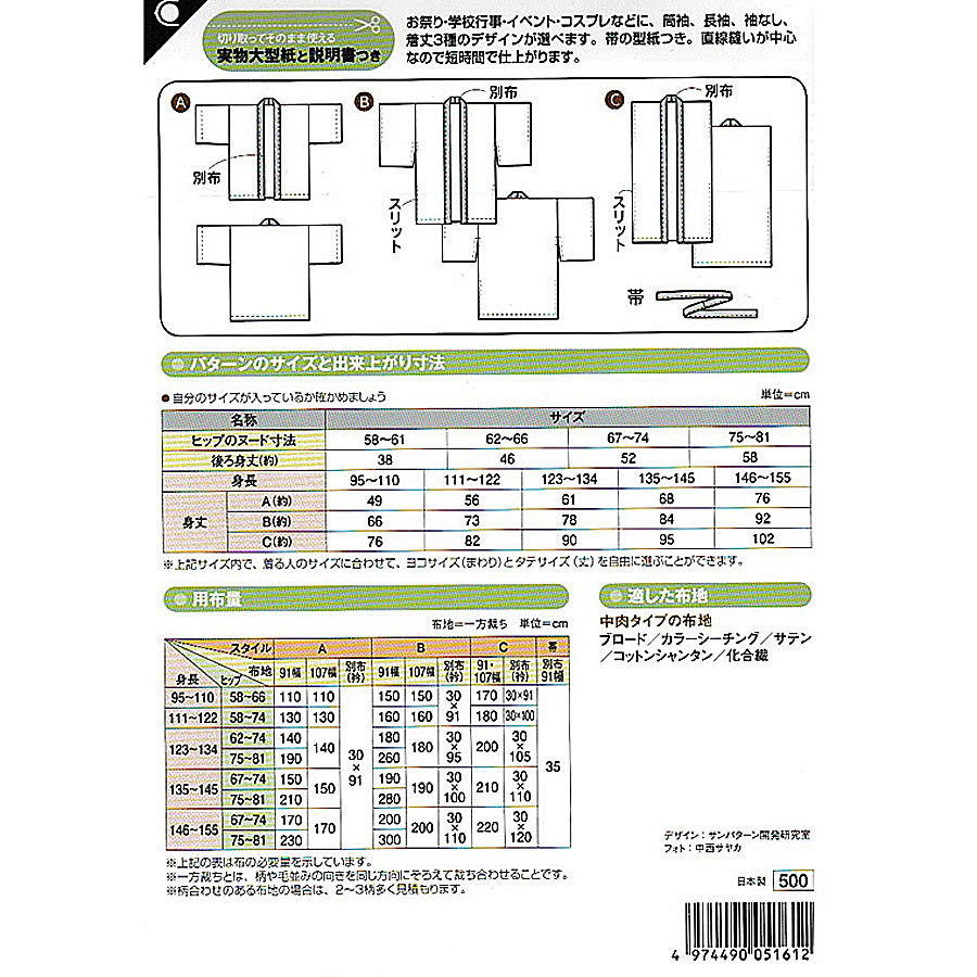 筒袖、長袖、袖なし、着丈3種のデザインが選べます。帯の型紙つき。