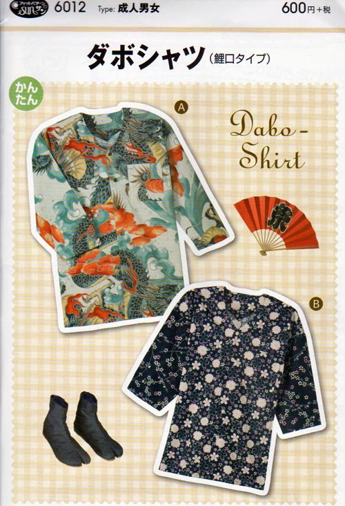 | 商品案内 | 袖口が鯉の口のようにすぼまったお祭り用の鯉口シャツ。肩は縫い目がない本格派! Bのデザインは別布で柄の組み合わせを楽しむ普段着仕様です。 ジーンズと合わせて、和風アロハシャツとしてもお洒落。 ※肩にはぎがないため、柄に方向性のある布地を使用の場合、後ろ身頃は柄の向きが上下逆になります(袖も同様)。 ○切り取ってそのまま使える実物大型紙と説明書つき。 |