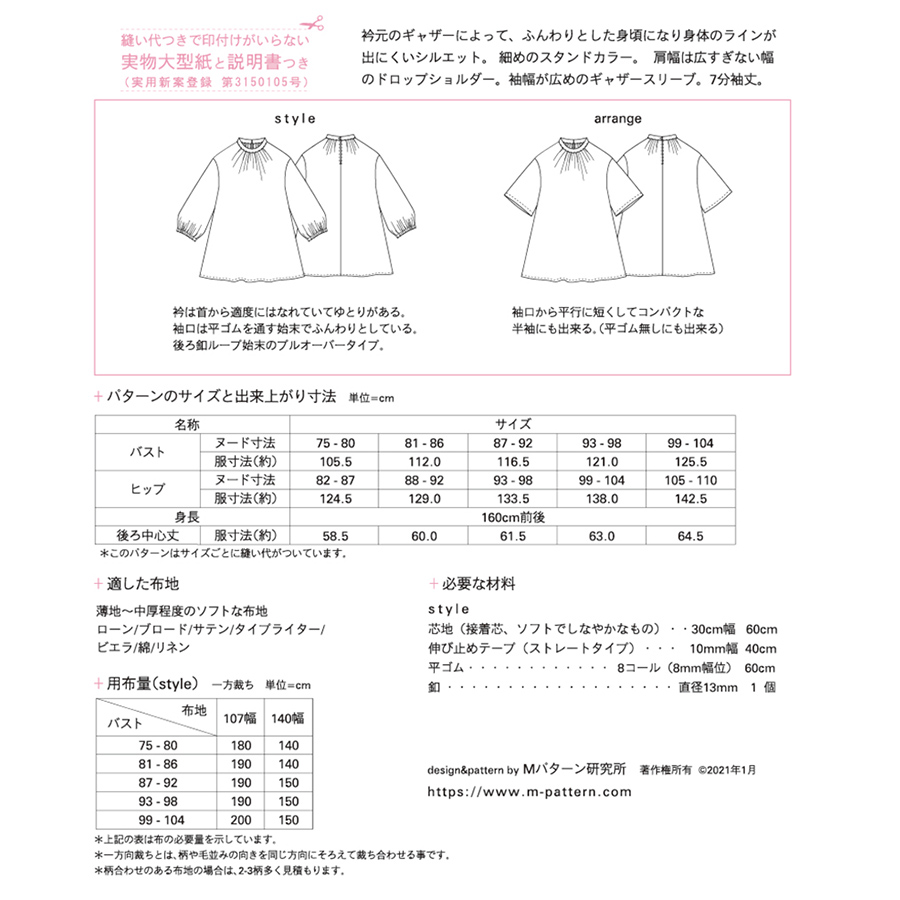 「ブラウス 型紙」「レディース トップス 型紙」「手作り大人服」「ソーイング初心者」におすすめのパターンです。