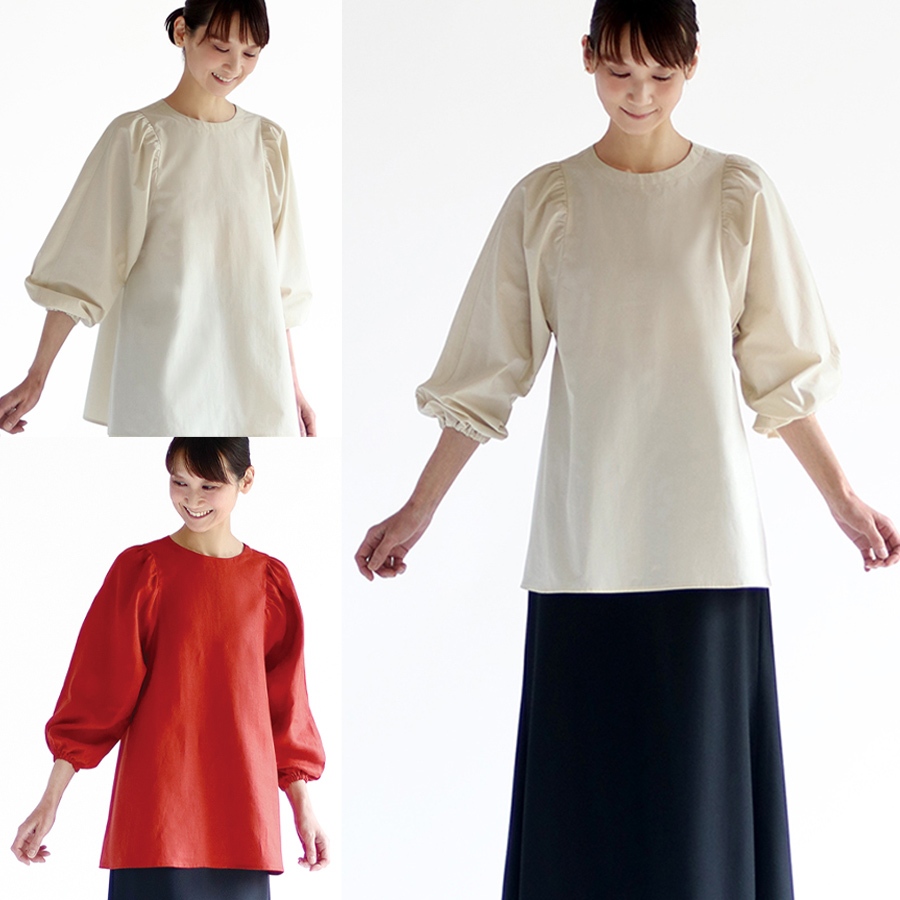 袖ぐりが広めに設計されているため動きやすく、ゆったりとした着心地。後ろは釦ループ開きで、プルオーバータイプとして簡単に仕立てられます。