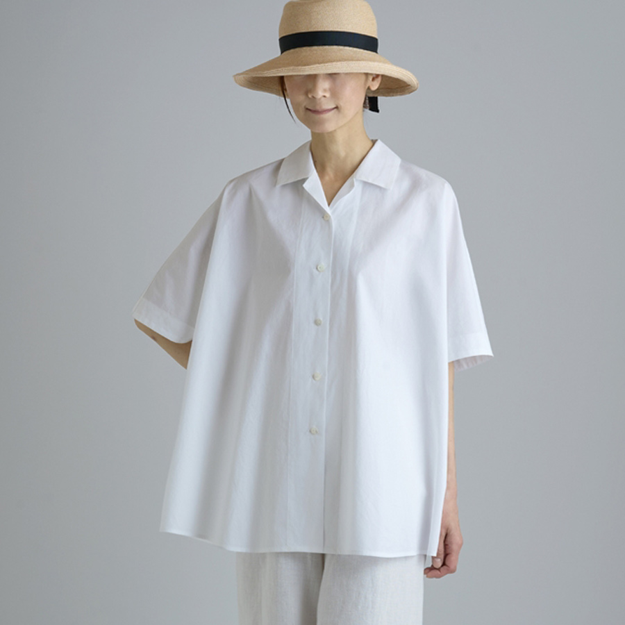 広い肩幅が半袖のように見える、フレンチスリーブのオープンカラーシャツ。