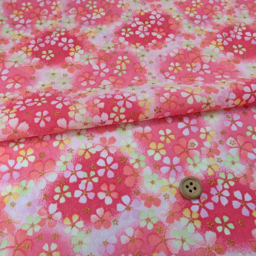 ●薄めの赤に、サーモンピンクや黄色・黄緑などのお花。やさしいトーンの赤系はちりめんでは案外珍しいかも。
