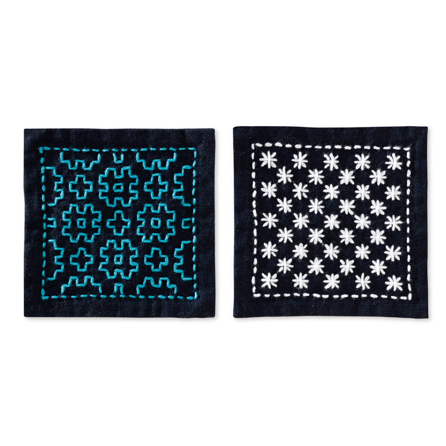 刺し子を始めてみたい人におすすめのキット。2枚のコースターで刺し子の技を学びます。