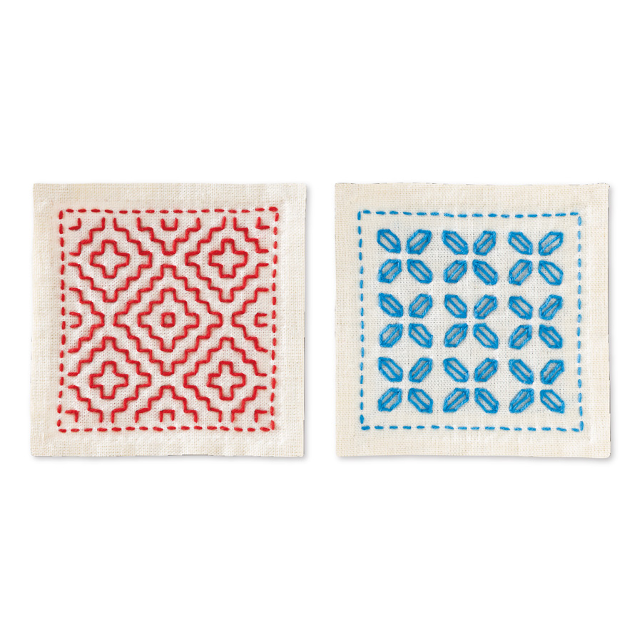 刺し子を始めてみたい人におすすめのキット。2枚のコースターで刺し子の技を学びます。