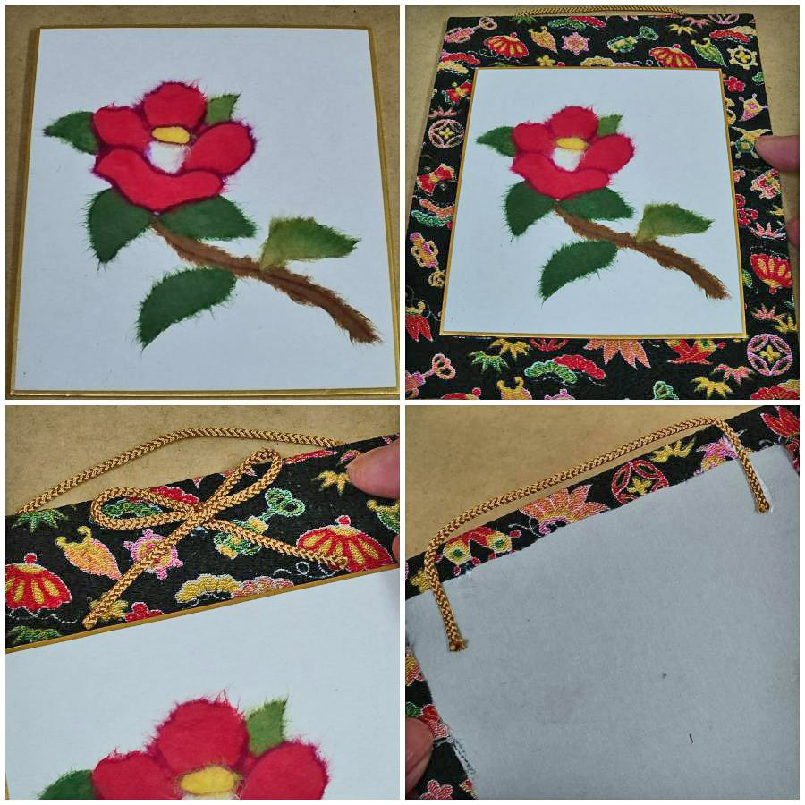 ミニサイズの色紙に和紙でちぎり絵を描き、京ちりめん貼りの色紙掛けを作って飾ります。ちぎり絵色紙だけでなく色紙掛けも作れるので、すぐに華やかに飾ることができますよ。