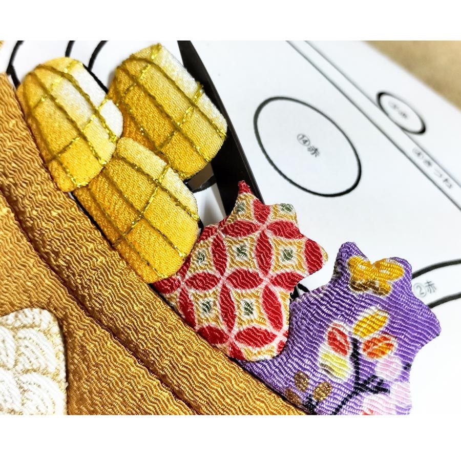 ●キット内容:ちりめん生地、ちりめんシール、紐、ウレタン付きボール紙、ボール紙、カットビーズ、水引、金糸、つまようじ、図案、台紙、型紙、作り方説明書