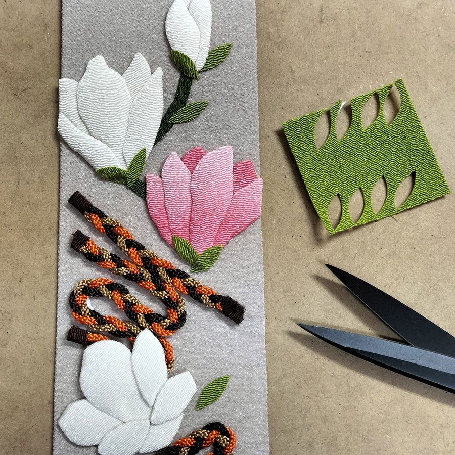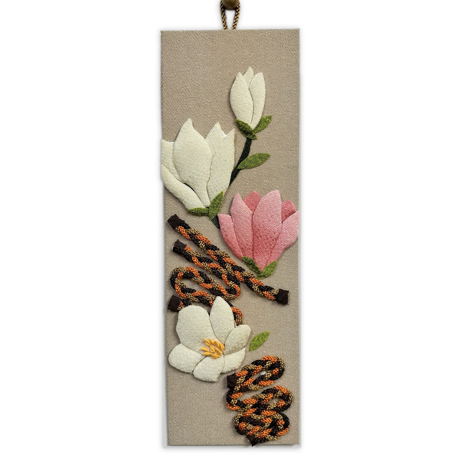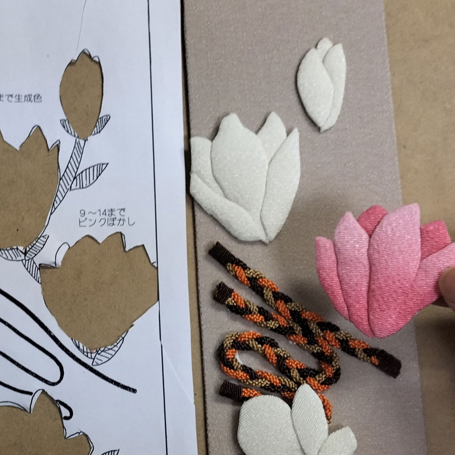 落ち着いた色合いの台布に、きなりとピンクぼかしのちりめんで形作った花びらがふっくらと重なり、春を告げる木蓮の上品な気配が感じられます。