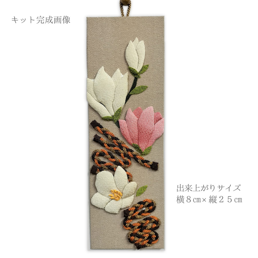 しっとりと咲く木蓮をモチーフにした、ちりめん押絵の手芸キットです。必要な生地や台紙、打ちひもなどがセットになっており、針や糸を使わずにボンドだけで仕上げられます。