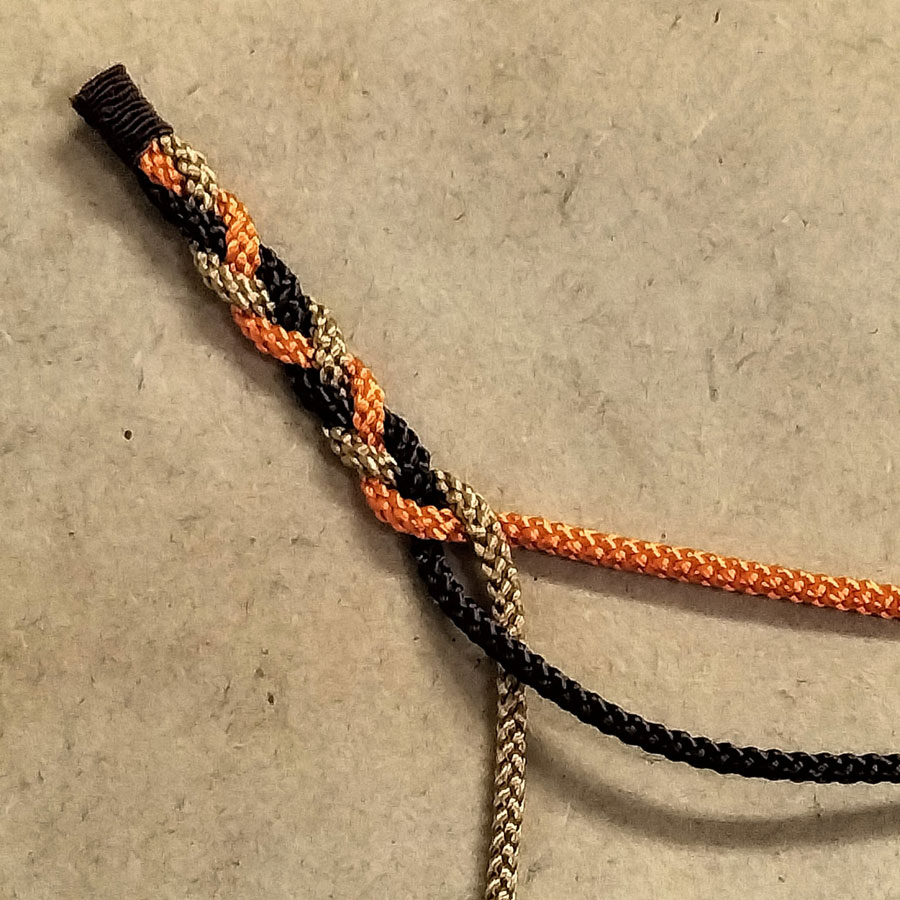 三色のひもを編んでふんわりと這わせることで、枝ぶりと流れるような動きが生まれ、シンプルな構図の中に華やぎが添えられています。