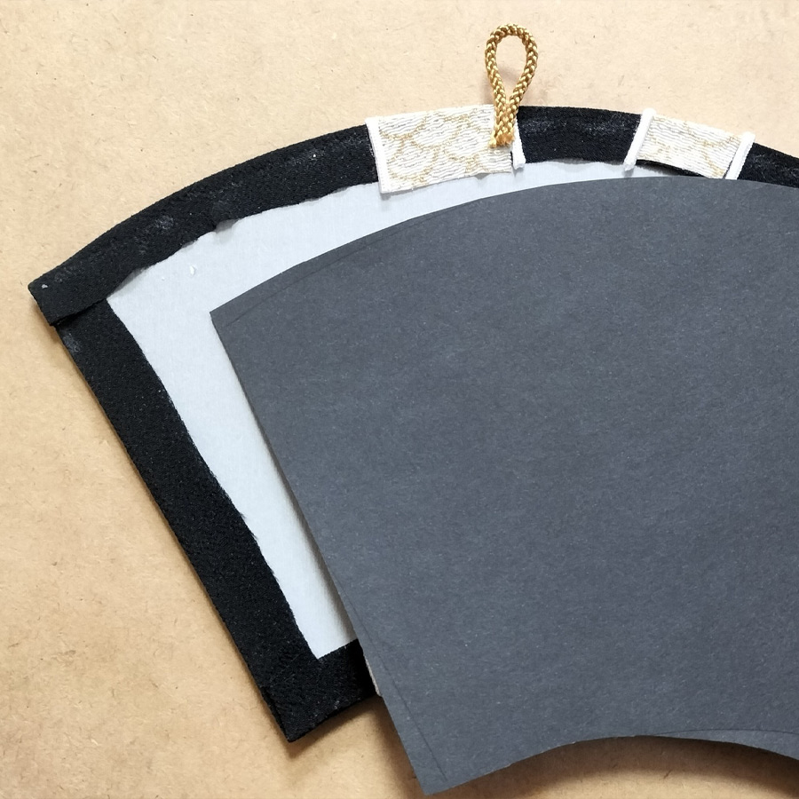 ●キット内容:末廣型の白ボール紙、裏用の黒い紙、ウレタン付ボール紙、ちりめん生地、ちりめんシール、紐、作り方説明書、図案