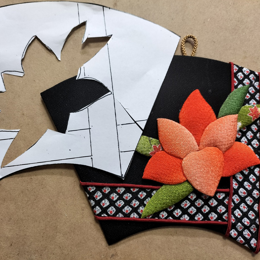 ●キット内容:末廣型の白ボール紙、裏用の黒い紙、ウレタン付ボール紙、ちりめん生地、ちりめんシール、紐、作り方説明書、図案