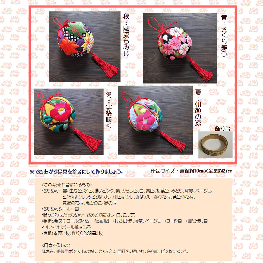 ●キット内容:ちりめん生地、ちりめんシール、貼り合わせたちりめん、手まり用スチロール球、紙管、ひも類、ウレタン付ボール紙、作り方説明書