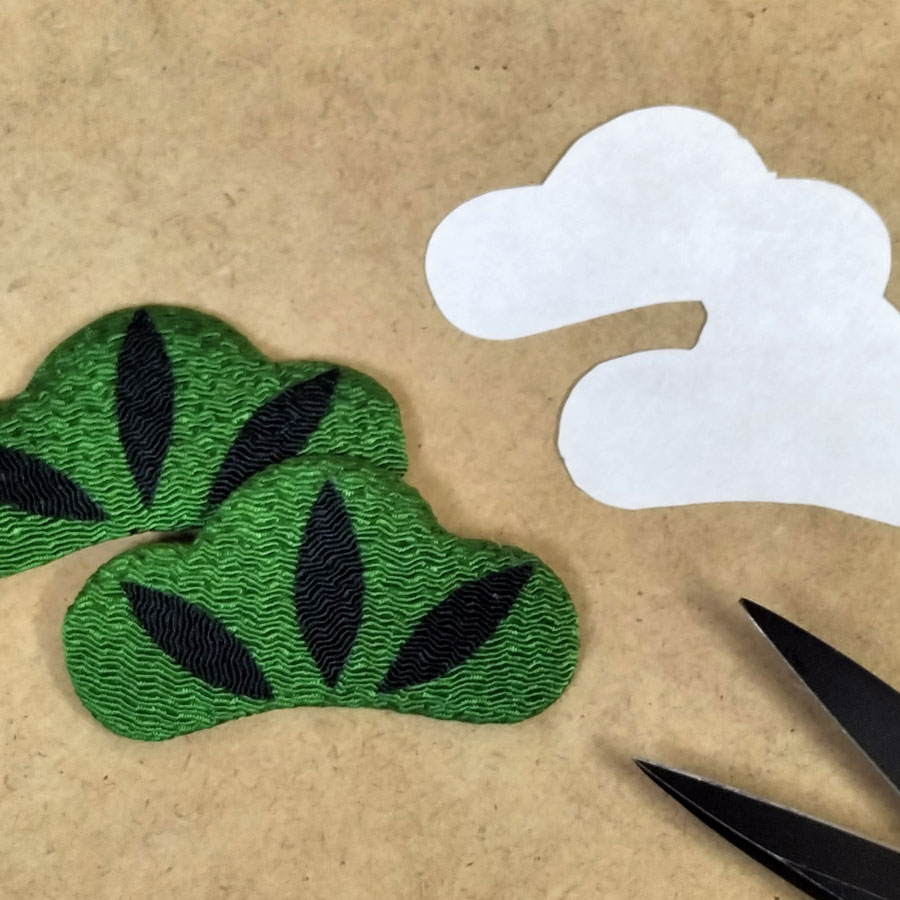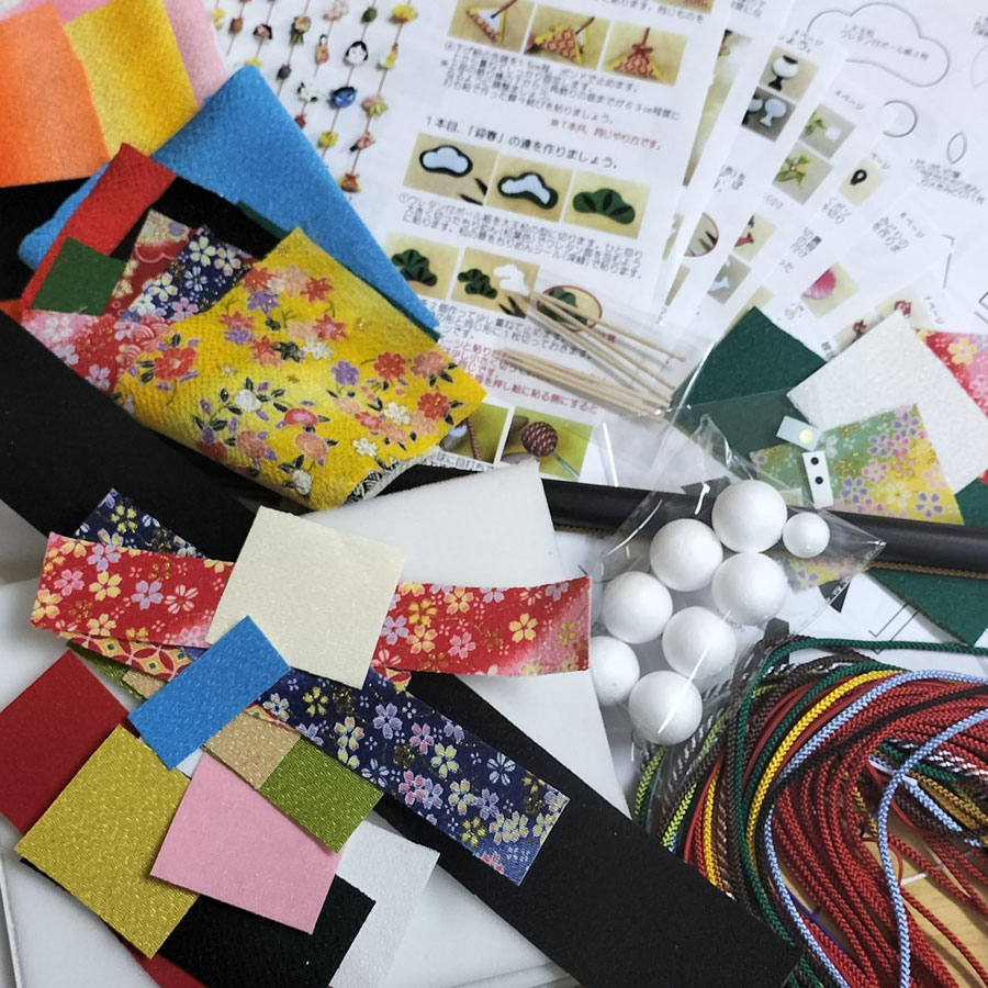 ●キット内容:ちりめん生地、ちりめんシール、貼合せたちりめん、紐類、ウレタン付ボール紙、ボール紙、飾り棒、爪楊枝、スチロール球、シール、ビーズ、型紙、説明書