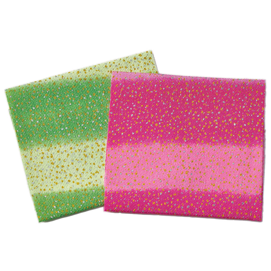 ◆弊店で販売中の「ちりめん生地 段ぼかしに金銀ふぶき」の「黄緑」と「ピンク」と同じ生地です。