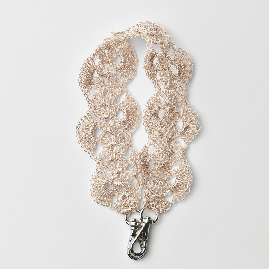 繊細な編み模様と上品な光沢感が魅力、ピンクゴールドのメタリックフリーコードで編むハンドストラップキットです。