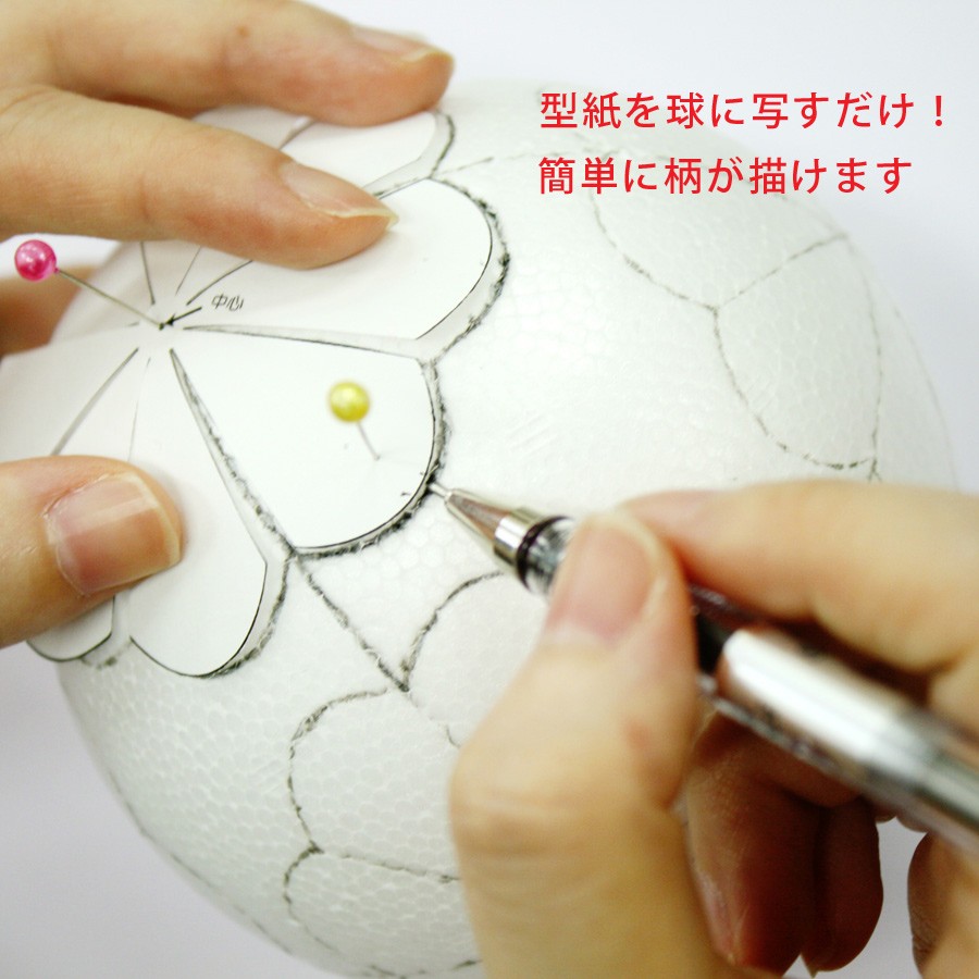 ●華やかで色鮮やかなちりめん生地を使った木目込みてまりのキット。型紙を土台に写すだけで簡単に柄が描け、美しい和の文様を楽しめます。