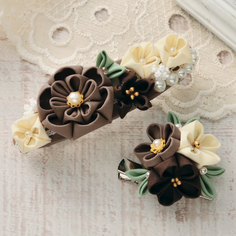 手作りキット 普段づかいのつまみ細工 バレッタとブローチ(チョコレート)