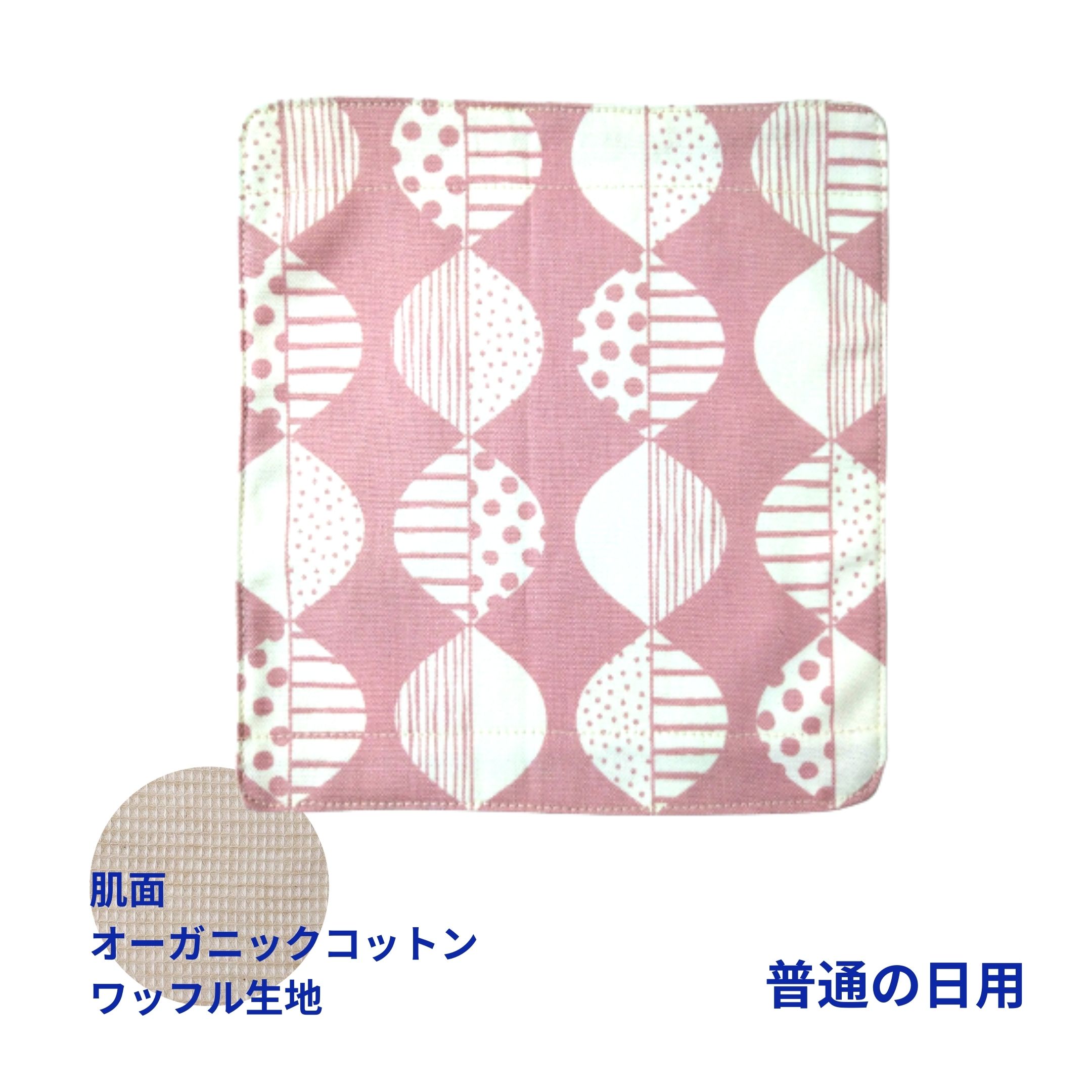 布ナプキン・ハンカチタイプです。(昼用・普通サイズ)三つ折りにしてご使用ください。ホルダーに挟んでのご使用をおすすめいたしますが、単品使用も可能です。肌にふれる部分はオーガニックコットンのワッフル生地。柄の布地は内部になります。<素材>外側(ショーツ側):コットン内側(肌側):オーガニックコットン吸収体(内部):オーガニックコットンフランネル糸:オーガニックコットン糸 <サイズ>縦:約20cm/横:約18cm*生地の裁断箇所により写真と柄が異なる場合がございますので、ご了承くださいませ。
