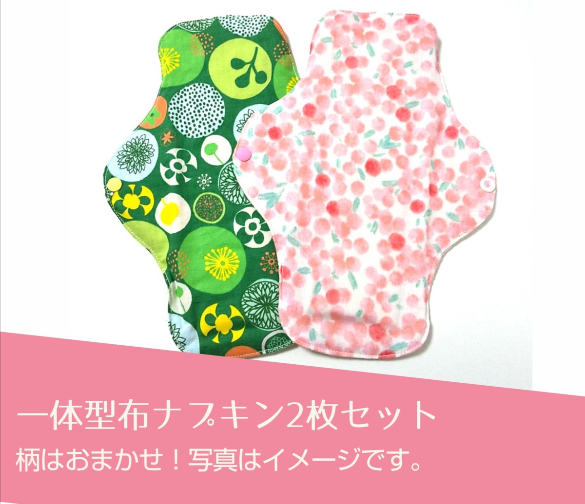 一体型布ナプキン(普通サイズ)2枚セット柄を選べないからお買い得。初めてチャレンジする時の洗い替え用にもう2枚あると便利です!肌に当たる生地は全てオーガニックコットン。柄の生地・スナップボタン以外も全てオーガニック素材。*生乾きによる菌の繁殖を防ぐため防水布は入っていません。もれが不安な場合は、使い捨てナプキンや防水シートの上に布ナプキンを置いてご使用ください。柄は完全におまかせとなります。写真はイメージとなります。<素材> 内側(肌側):オーガニックコットン 外側(ショーツ側):コットン吸収体:オーガニックコットンフランネル糸:オーガニックコットン糸 プラスチックスナップ<サイズ> 縦:約22cm /横:最大約16cm【お客様の声】○東京都・YU様暖かさに驚きました。○神奈川県・SN様体の調子が良くなりました。○神奈川県・YY様洗濯も慣れれば面倒ではないです。○東京都・EK様ふんわりして、心地よい。蒸れない。