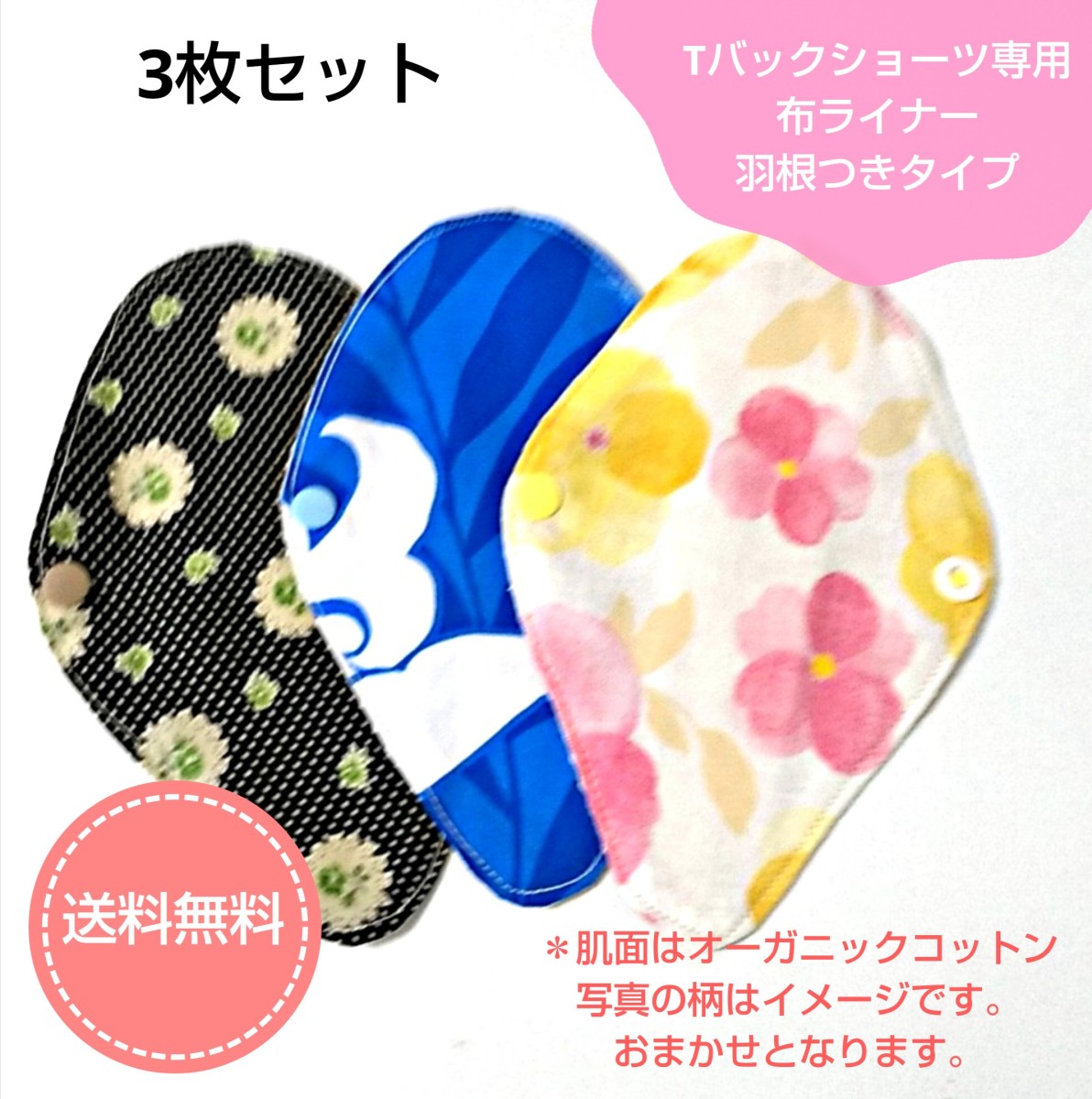 Tバック 専用 布ライナー 3枚セット 羽根つきタイプ おりもの用 生理用ナプキン 布ナプキン 柄はおまかせ オーガニック コットン 送料無料 TLS3-2