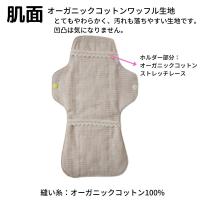夜用布ナプキン(縦長さ約29cm)お肌側から、オーガニックコットン・吸収体生地3層(内部)・透湿性防水布(内部)・コットンの6層構造です。長めで夜も安心。肌面はオーガニックコットンのワッフル生地になります。凹凸は気になりません。肌触りの良い生地です。布パッドやハンカチタイプの布ナプキンをホルダー部分に挟むと厚みが増します。布パッド無しでご使用の際は、ホルダー部分(レース)を柄の方の生地にひっくり返してご使用ください。<素材>柄の布地:コットンベージュ色の布地:オーガニックコットン内部:オーガニックコットンフランネル・透湿性防水布糸:オーガニックコットン糸レース:オーガニックコットンレース プラスチックスナップ<サイズ>夜用 縦:約29m/横:最大約17cm(羽部分)*写真と色が違う場合もございます。また、裁断箇所により柄の出方が異なる場合がございます。ご了承くださいませ。